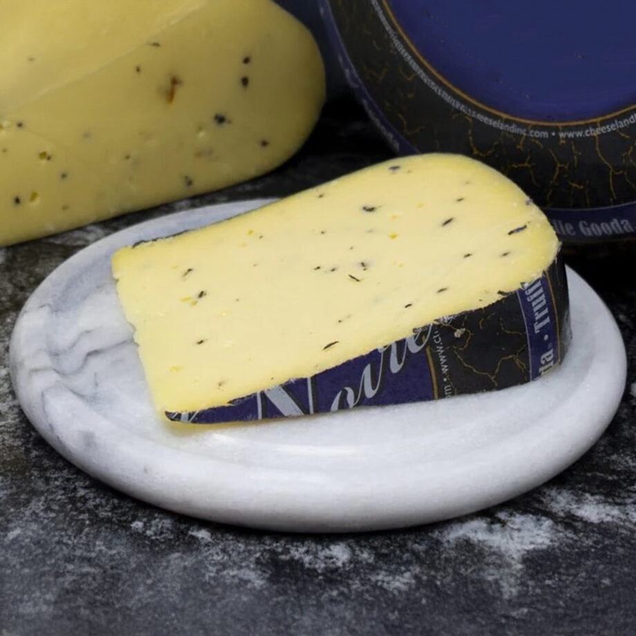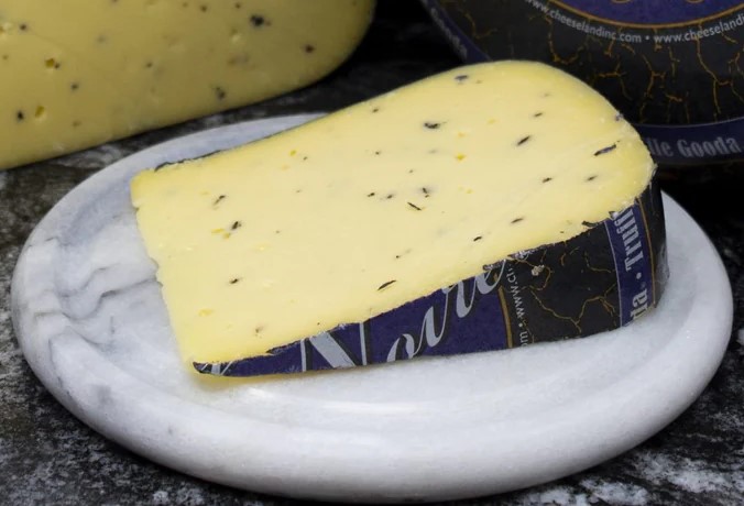 Tomme trufada es un queso elaborado con leche cruda de vaca, de pasta prensada no cocida. Su pasta es suave , de color marfil llegando a ser amarillo pálido y su corteza floral, de color beige. Al corte, es fácilmente visible pequeños trozos de trufa negra. Este queso es un delicioso aperitivo y cortado en dados pequeños, aporta un toque de fantasía culinaria despertando las papilas gustativas; no debemos olvidar que el queso no solo esta reservado para degustarlo entre el plato principal y el postre. Los aromas de tomme seducen, embriagan e invitan a compartir una excelente copa de champágne.
